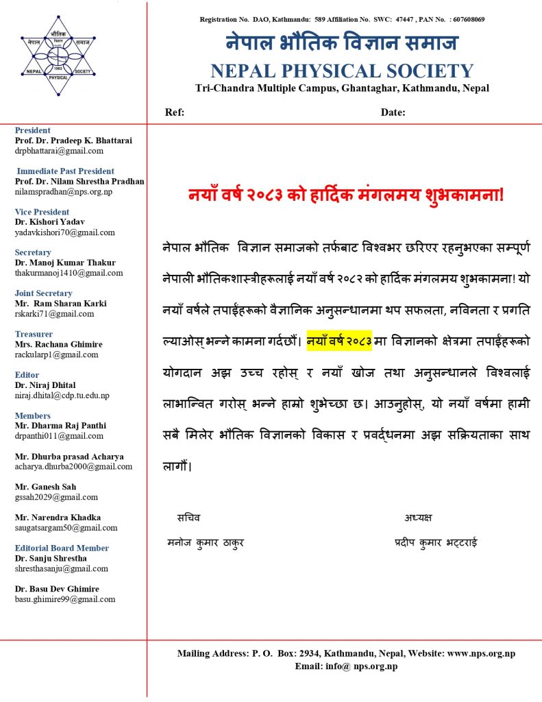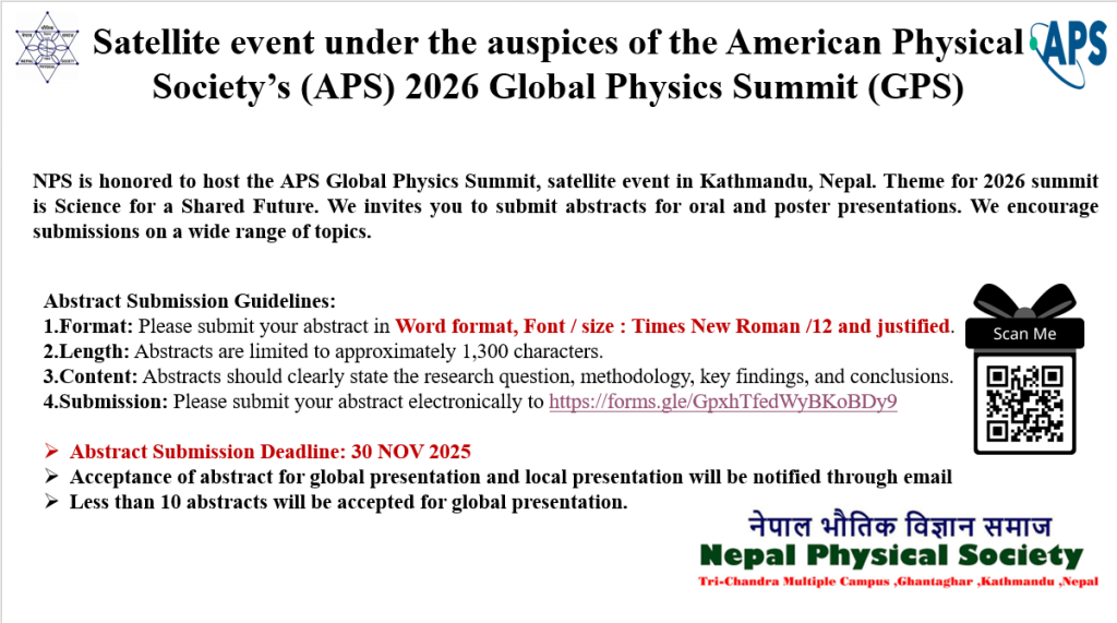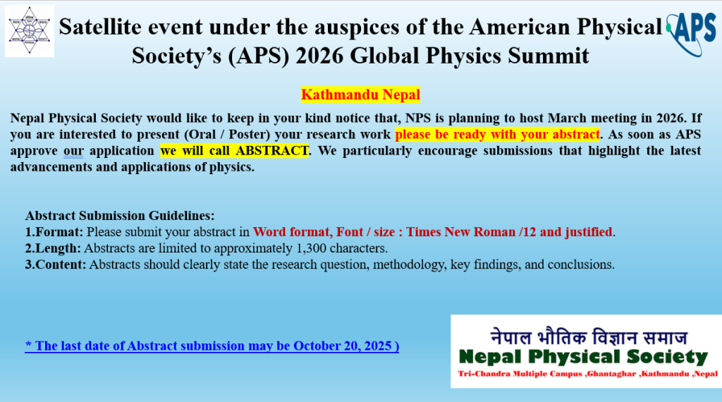 # ANNUAL MEETING 2082 *Please fill the form if you are recent graduate : https://forms.gle/LwPkRxXw8taQpvDaA before 30 June 2025 *Please submit your abstract, if you wish to present in NPS annual meeting (nepalphysicalsociety2022@gmail.com) before 30 June 2025.